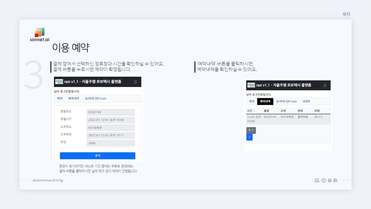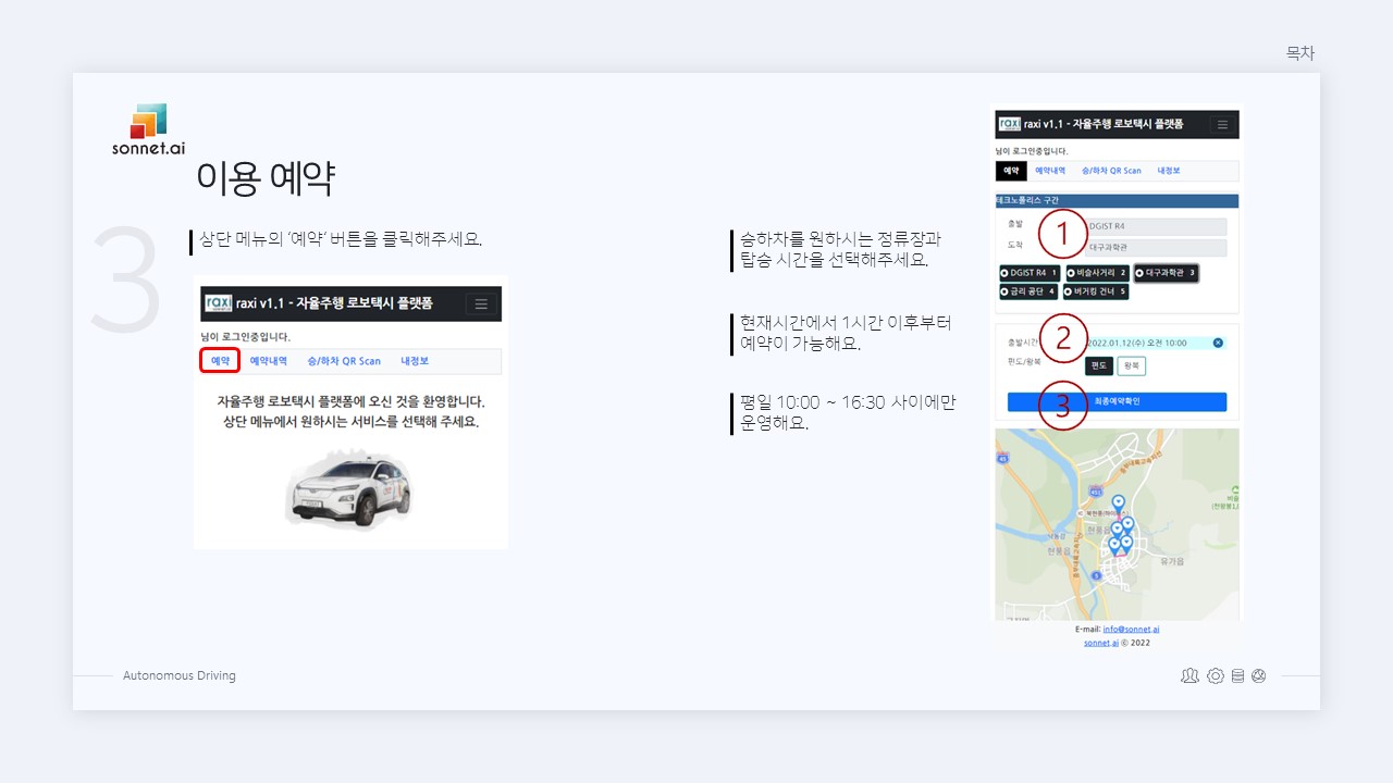 | 자율주행 로보택시 Raxi 이용 안내 ② 예약하기 (0) | 2022.03.22 |