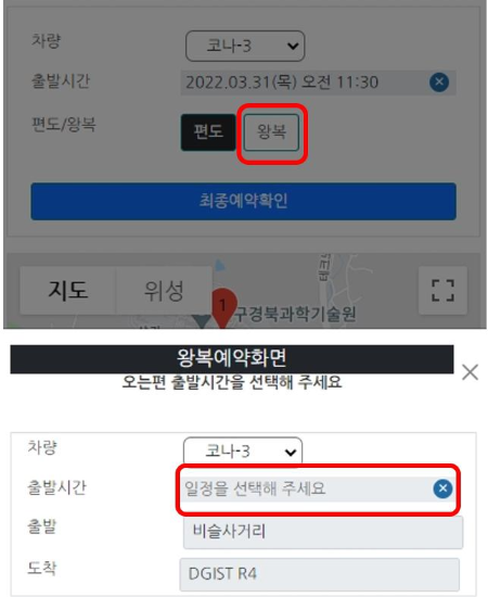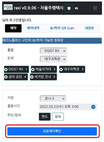 ④ 정류장, 차량, 시간을 확인하신 후 최종예약확인 버튼을 누르시면 예약이 진행됩니다.